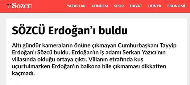 "Altı gündür kameraların önüne çıkmayan Cumhurbaşkanı Tayyip Erdoğan'ı Sözcü buldu. Erdoğan'ın iş adamı Serkan Yazıcı'nın villasında olduğu ortaya çıktı. Villanın etrafında kuş uçurtulmazken Erdoğan'ın balkona bile çıkmaması dikkatten kaçmadı."
