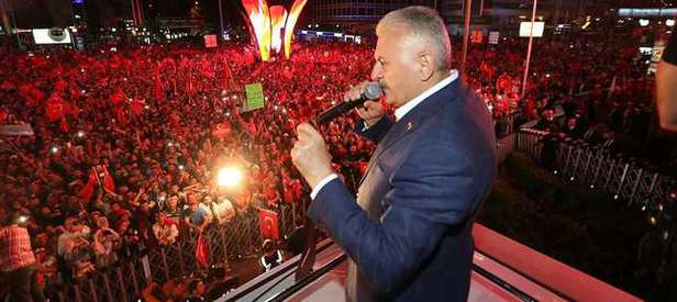 Alanda bulunanlara, "Siz 15 Temmuz'daki darbe girişimini yok eden ve milletin sesini dünyaya duyuran aziz Türk milletinin evlatlarısınız" diye seslenen Yıldırım, vatandaşların, "İdam isteriz" diyerek bağırmaları üzerine, mesajı aldıklarını belirtti.