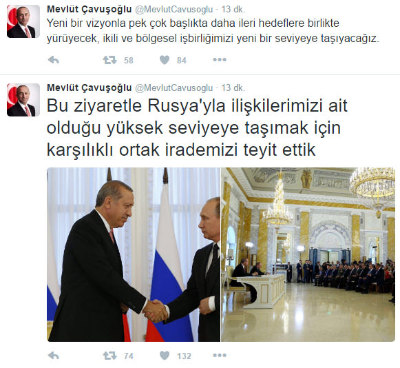Cumhurbaşkanı Recep Tayyip Erdoğan'ın Rusya Devlet Başkanı Vladimir Putin ile yaptığı görüşmenin ardından Bakan Çavuşoğlu Twitter'dan paylaşımlarda bulundu.