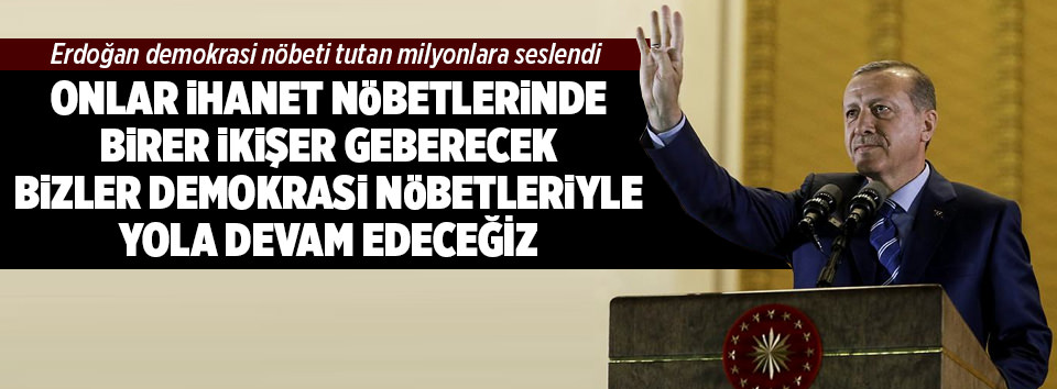 Cumhurbaşkanlığı Külliyesi önündeki coşkulu kalabalığa hitap eden Cumhurbaşkanı Erdoğan, nöbetin bittiğini açıkladı. Erdoğan, "Demokrasi nöbetlerindeki coşkusu ve vakarıyla ülkesine ve milletine olan bağlılığını cümle aleme ilan eden vatandaşlarıma teşekkür ediyorum. Allah, ülkemizi ve milletimizi ilelebet korusun diyorum. Ve şimdi artık virgülü atıyoruz ve bu demokrasi nöbetlerine artık ara veriyoruz. Ama ruh dünyamızdan, gönül dünyamızdan bu nöbetleri çıkarmayacağız" dedi.