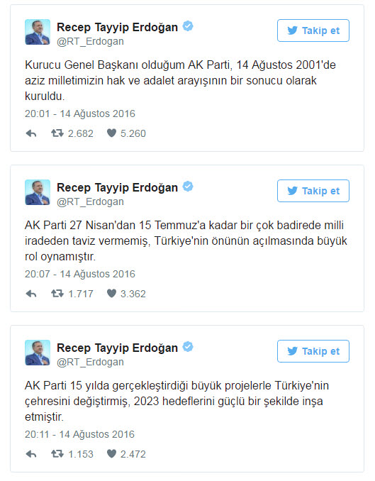 Cumhurbaşkanı Erdoğan, ilk mesajını AK Parti'nin kuruluş yılı 2001'e atıfta bulunarak, saat 20.01'de, son mesajını ise 15. kuruluş yıl dönümüne atfen 20.16'da paylaştı.