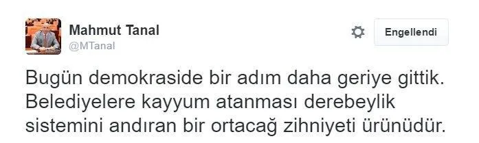 CHP İstanbul Milletvekili Mahmut Tanal; konuyla ilgili Twitter'dan yaptığı açıklamada,"Bugün demokraside bir adım daha geriye gittik. Belediyelere kayyum atanması derebeylik sistemini andıran bir Ortaçağ zihniyeti ürünüdür." ifadelerini kullandı.