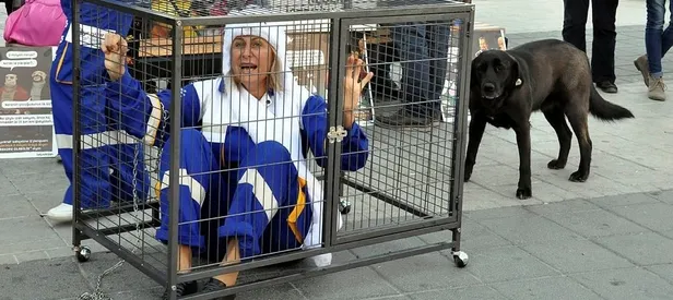 Daha sonra beraberinde getirdikleri kafeslere giren hayvanseverler, hayvanların doğal ortamlarından uzaklaştırılmalarını protesto etti.