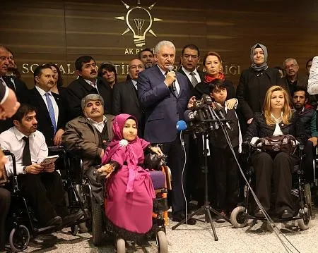 Başbakan Binali Yıldırım, AK Parti Genel Merkezi'nde Engelliler Koordinasyon Merkezi'ni ziyaret etti. Burada yaptığı konuşmada Yıldırım, "Engelliler kendini ifade edemiyordu. AK Parti iktidarıyla beraber engellileri aşağılayan, kanunlardaki çürük, sakat, özürlü yapılarını çıkararak işe başladık. Engellilerin tamamını kapsayan kucaklayan yeni bir yasal düzenleme yaptık. Birçok hizmeti engellilerimizin topluma kazandırılması, iş hayatına kazandırılması, kabiliyetlerinin, uzmanlıklarının ortaya çıkarılması için çok köklü çalışmalar yaptık. Allah'a şükür bugün Türkiye genelinde 481 bin evde bakım hizmeti ayrıca kamuda da 150 bin engelli çalışıyor. Sadece kamuda özel sektörü saymıyorum. Özel sektörde de mecburiyet var. Belirli bir sayıyı aştıktan sonra bir miktarda engelli çalıştırmak gibi bir yükümlülük var" diye konuştu.