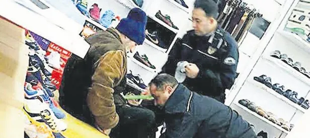 İki polis, yaşlı adamın yırtık ayakkabılarına dayanamadı. Ona mağazadan bir çift pabuç aldı. Liseli Ebrar tesadüfen bu anı fotoğrafladı. “İçimiz ısındı” diyerek sosyal medyadan yayınladı