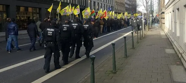 Terör örgütü PKK'nın propagandasını yapmak üzere sokağa çıkan terör yandaşlarına Alman hükümetince özel polis kalkanı görevlendirildi. Düsseldorf şehrinde PKK'lı teröristlerin yaptığı yürüyüşte Alman polisi kalleşleri himayesi altına aldı.