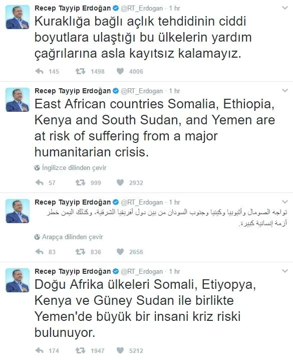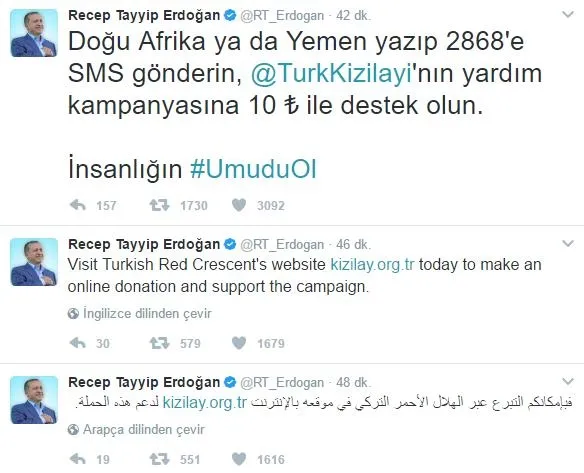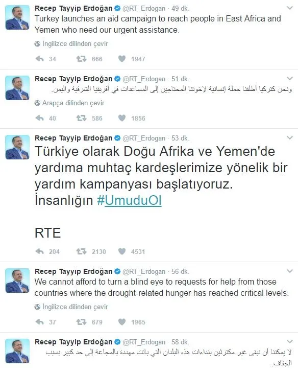 Erdoğan, "Doğu Afrika ülkeleri Somali, Etiyopya, Kenya ve Güney Sudan ile birlikte Yemen'de büyük bir insani kriz riski bulunuyor. Kuraklığa bağlı açlık tehdidinin ciddi boyutlara ulaştığı bu ülkelerin yardım çağrılarına asla kayıtsız kalamayız. Türkiye olarak Doğu Afrika ve Yemen'de yardıma muhtaç kardeşlerimize yönelik bir yardım kampanyası başlatıyoruz. İnsanlığın Umudu Ol. Doğu Afrika ya da Yemen yazıp 2868'e SMS gönderin, Türk Kızılayı'nın yardım kampanyasına 10 lira ile destek olun" paylaşımlarında bulundu.