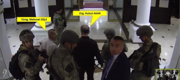 Genelkurmay Başkanı Akar, saat 23.03'te darbeci 5 özel kuvvetler personelinin arasında, yanında eski Tümgeneral Mehmet Dişli ile merdivenlerden inerek bahçeye çıkarıldı. O sırada koruma olduğu tahmin edilen bir kişinin, karargaha girip komutanın şapkasını alarak geri döndüğü de iddianamedeki görsellere yansıdı.
