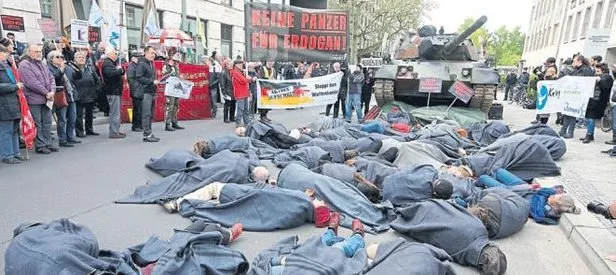 Almanya, Türk düşmanlığında zirve yaptı. PKK ve FETÖ'ye karşı operasyonların durmaması halinde AB görüşmelerinin askıya alınacağı tehdidinde bulundu. Bununla da yetinmedi; Alman hükümeti PKK'yı vurdukları için artık Türkiye'ye silah satmayacağını açıkladı. Alman firması Rheinmetall ise bu duruma isyan etti. Türkiye'de tank üretimi yapmayı planlayan şirket, bunu engelleyen Federal Hükümet ile görüşmelere başladı. Fakat Alman medyasının yalanlarına inanan Alman vatandaşları da PKK'yı savunmak için gösteriler yaptı. Dün Berlin'de terör örgütü PKK ve YPG bayrakları taşıyanlarla beraber Almanlar da tankların Türkiye'de üretimine karşı sahneye çıktı. Berlin'deki eylemde hazırlanan maketin önüne geçen bir grup, tepkilerini göstermek için önce ellerini havaya kaldırdı daha sonra Türk tankı tarafından ateş edildiğini göstermek adına kendilerini yere attı. Protesto sırasında ayrıca "Erdoğan'a tank yok" sloganları atılırken, aynı sloganın yazılı olduğu pankartlar açıldı.