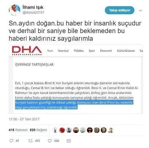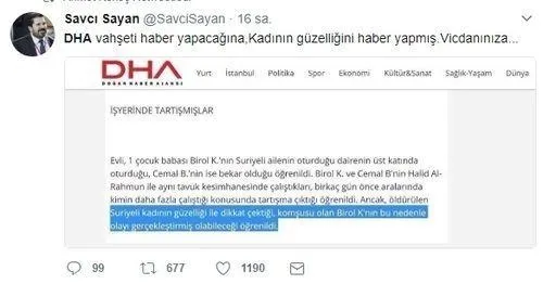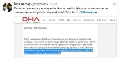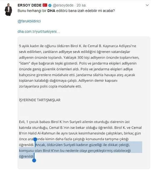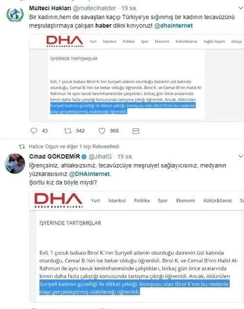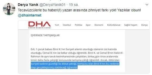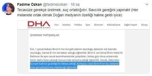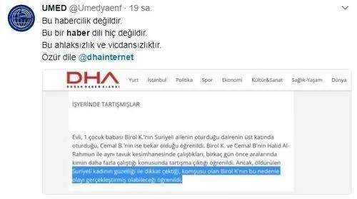 Doğan Haber Ajansı, tecavüze uğrayarak 10 aylık bebeği ile birlikte vahşi bir şekilde öldürülen Suriyeli anne ile ilgili haberinde "kadının güzelliğinden dolayı bu saldırıya maruz kaldığı" gibi bir gerekçe göstererek Suriyelilere yönelik bu vahşice saldırıyı normalleştirmeye çalışmıştı. Günlerdir Suriyeli mültecileri ötekileştiren haberler servis eden Doğan Haber Ajansı'na tepkiler çığ gibi büyüyor.