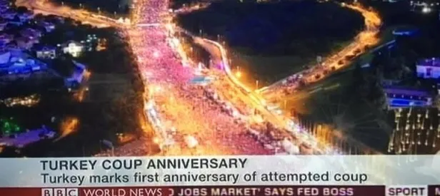 '15 Temmuz Şehitler Köprüsü'ne akın edenleri manşetine taşıyan BBC, 'Türkiye'deki darbe girişiminin yıldönümünde dev miting' başlığını kullandı, manşete ellerindeki Türk bayraklarını sallayan kalabalığın fotoğrafı eşlik ediyor.