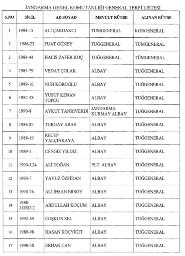 Kararname ile 3 general ve 14 albay, bir üst rütbeye terfi ettirildi.