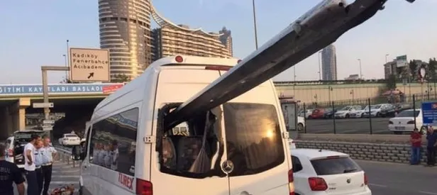 İstanbul Kadıköy'de meydana gelen trafik kazasında, servis minibüsünün ön kısmından içeri bariyerler arka camından dışarı çıktı.