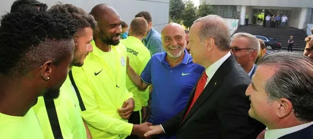 Bir süre Teknik Direktör Hikmet Karaman'la da görüşerek takım hakkında bilgi alan Erdoğan ardından yeşil beyazlı futbolcularla tokalaşarak sohbet etti.