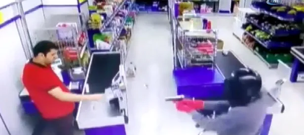 Güvenlik kameralarına yansıyan görüntülerde, kasiyere kasada beklediği esnada silahlı soyguncu içeriye giriyor. Soyguncunun silah doğrultması üzerine kasiyer, ellerini havaya kaldırarak depoya doğru yürümeye başlıyor. O esnada müşteriler hiçbir şey olmamış gibi alışveriş yapmaya devam ediyor. Kasiyeri ofise kilitleyen soyguncu ardından kasadan paraları alarak kayıplara karışıyor. Diğer soyguncu ise motosikletin üzerinde gaspçının gelmesini bekliyor.