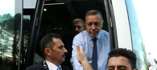 Cumhurbaşkanı Erdoğan, referandumdan önceki ziyaretinde görüp sevdiği ‘Cesur’ isimli köpeği otobüsten inip tekrar sevdi.