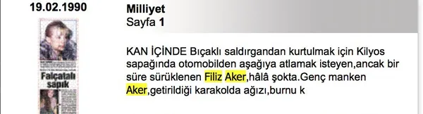 Filiz Aker aslında medyaya hiç yabancı değil. 1990 yılında Kilyos'ta falçatalı saldırıya uğramış. İşte Milliyet'in yaptığı o günkü haber;