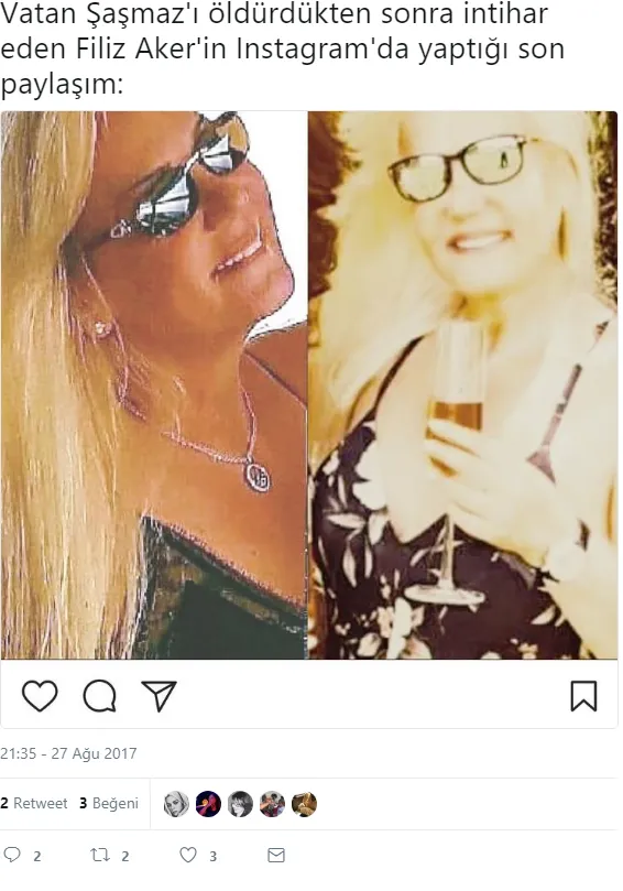 İddiaya göre, Vatan Şaşmaz ile Filiz Aker odada tartışmaya başladıktan sonra Filiz Aker, kaçmaya çalışan Vatan Şaşmaz'a arkasından 3-4 el ateş ederek öldürdü. Daha sonra da silahı kafasına doğrultarak tetiği çekti ve intihar etti.