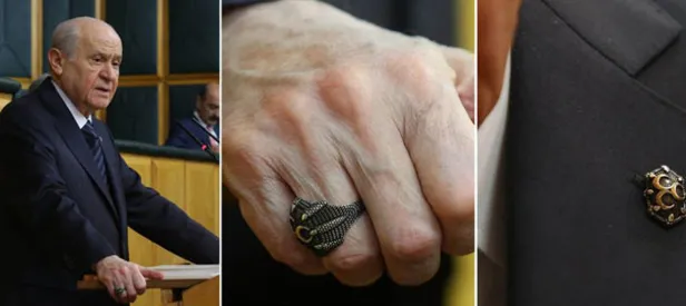 MHP liderinin, MHP'ye genel başkan olmasının 20 yıl dönümü nedeniyle hediye edilen yüzük ve rozeti dikkat çekti.