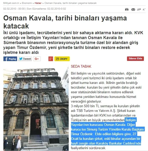 Milliyet'in haberinde Osman Kavala'nın Tarih Vakfının sponsoru olduğunu ve eski tekstilci Timur Özdemir ile ortak şirket kurarak Cihangir'deki tarihi binaları "yaşama katacağını" öğreniyorduk. Merak edenlere, TSB Turizm ve Yatırım A.Ş'nin 2010 yılında kurulduğunu ve 2012 yılında tasfiye kararı alındığını açıklayalım. Anlaşılan Kavala'nın kızıl milyarları şirketi ayakta tutmaya yetmemiş.