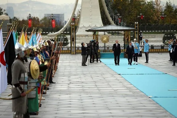 Konuk Devlet Başkanı Mirziyoyev, Muhafız Alayı Tören Kıtası'nı "Merhaba asker" diyerek selamladı. Törende, tarihte kurulan 16 Türk devletini temsil eden bayraklar ve askerler de yer aldı.