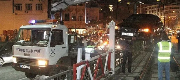 İstanbul'da bir otomobil, Galata Köprüsü girişinde tramvay yoluna girdi. Araç, demir bariyerlere çarparak durdu.