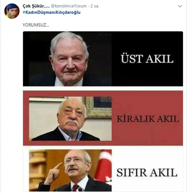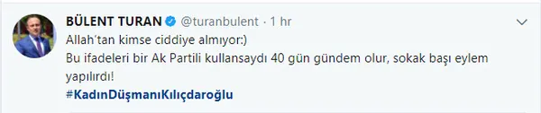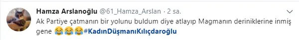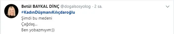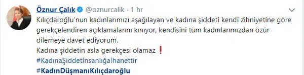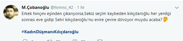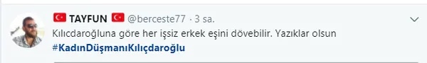 CHP Genel Başkanı Kemal Kılıçdaroğlu, kadına şiddetle ilgili bir soruya, "Erkek işsizse, eve yeteri kadar para gelmiyorsa bu erkek de hıncını gelir, karısından alır" dedi. Kılıçdaroğlu'nun kadınlara şiddeti meşru gören sözlerine Twitter'da #KadınDüşmanıKılıçdaroğlu hashtagiyle tepki yağdı.