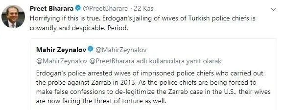 Rıza Sarraf davasını başlatan ve Trump göreve geldikten sonra kovulan ABD’li eski savcı Preet Bharara, FETÖ’cü Mahir Zeynalov’un tweetini alıntılayarak Türkiye için seviyesiz ifadeler kullandı. Zeynaolv’un FETÖ’nün kadın üyelerine dair yanlış yönlendirici tweetini alıntılayan Bharara “Eğer bu doğruysa çok korkunç. Erdoğan’ın Türk emniyet müdürlerinin eşlerini hapse attırması korkakça ve alçakçadır. O kadar” yazdı. Paylaşım, sözde bağımsız savcının ve Rıza Zarraf davasının kimin tarafından ne amaçla başlatıldığını göstermesi açısından dikkat çekti.
