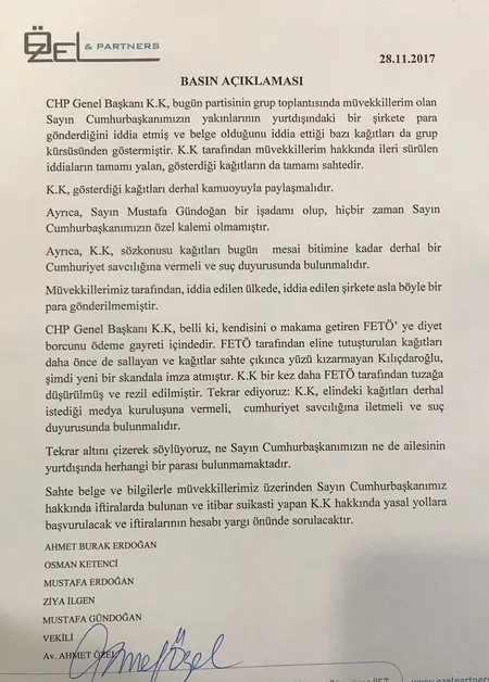 Müvekkillerimiz tarafından iddia edilen ülkede, iddia edilen şirkete asla öyle bir para gönderilmemiştir. CHP Genel Başkanı K.K, belli ki kendisini o makama getiren FETÖ'ye diyet borcunu ödeme gayreti içindedir. FETÖ tarafından eline tutuşturulan kağıtları daha önce de sallayan ve kağıtlar sahte çıkınca yüzü kızarmayan Kılıçdaroğlu, şimdi yeni bir skandala imza atmıştır. K.K, bir kez daha FETÖ tarafından tuzağa düşürülmüş ve rezil edilmiştir. Tekrar ediyoruz: Kılıçdaroğlu, elindeki kağıtları derhal istediği medya kuruluşuna vermeli, Cumhuriyet savcılığına iletmeli ve suç duyurusunda bulunmalıdır. Tekrar altını çizerek söylüyoruz ne Sayın Cumhurbaşkanımızın ne de ailesinin yurt dışında herhangi bir parası bulunmamaktadır. Sahte belge ve bilgilerle müvekkillerimiz üzerinden Sayın Cumhurbaşkanımız hakkında iftiralarda bulunan ve itibar suikastı yapan K.K. hakkında yasal yollara başvurulacak ve iftiraların hesabı yargı önünde sorulacaktır."