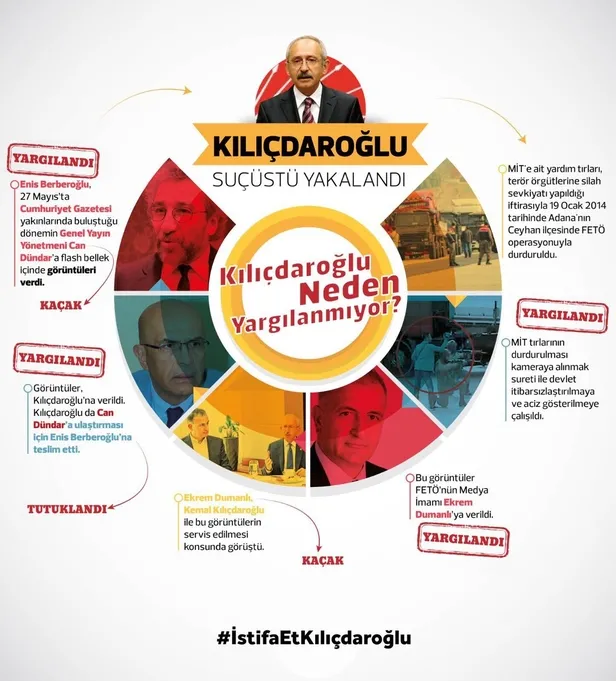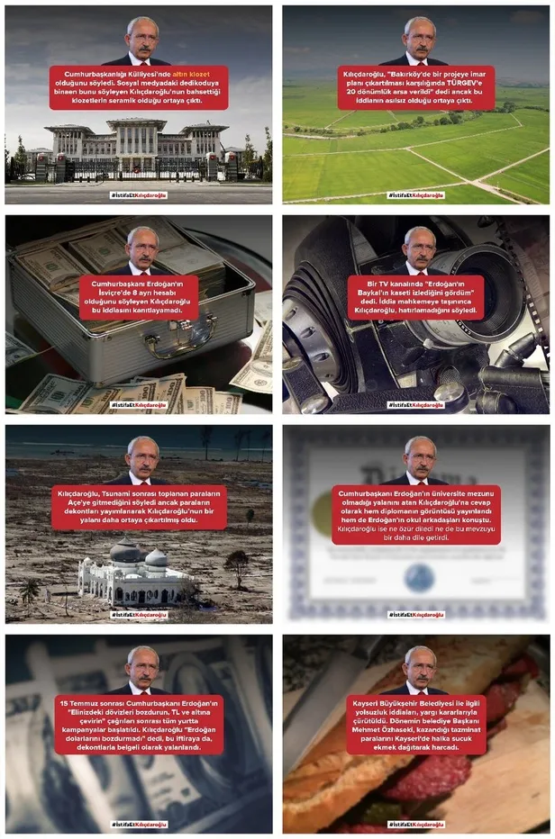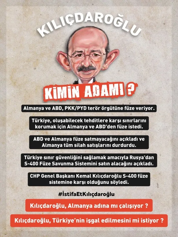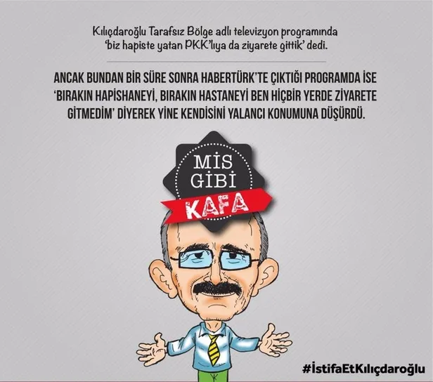 Cumhurbaşkanı Erdoğan hakkındaki mesnetsiz iddialarını ispatlayamayan CHP Genel Başkanı Kemal Kılıçdaroğlu'na tepkiler çığ gibi büyüyor. Sosyal medya üzerinden #İstifaEtKılıçdaroğlu etiketine yazan taraflı tarafsız herkes adeta FETÖ ve PKK'nın sözcüsü, Amerikan ve Alman ajanı gibi çalışan Kılıçdaroğlu'nun yalanlarından bıktıklarını ve istifa etmesi gerektiği belirtti.