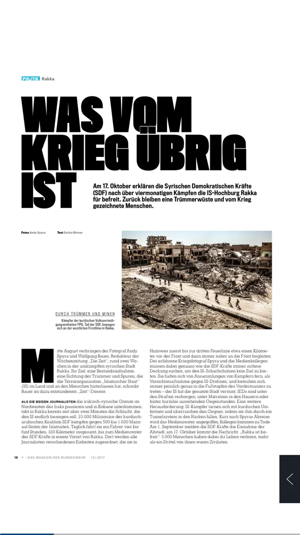 Sylvia Börner'in yazdığı girişi yazısında ise ana hattını YPG'nin oluşturduğu SDG'nin Rakka'nın kurtuluşunda önemli bir rol üstlendiği iddia ediliyor.