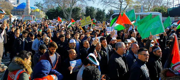 İSTANBUL: Kentte en büyük protesto gösterisi Fatih Camisi'nde yaşandı. Vatandaşlar kontrol noktalarından aranarak camiye giriş yaptı. Onbinler cami avlusuna sığmadı. Cuma namazının ardından mahşeri kalabalık, Kudüs için Saraçhane'ye yürüdü ve burada Beyazıt Camisi'nden gelen kalabalıkla buluştu. Yürüyüş boyunca "Katil İsrail, Kudüs'ten defol" sloganları atıldı. Türk ve Filistin bayrakları eşliğinde Saraçhane Parkı'na ulaşan kalabalık burada ABD ve İsrail'e lanet okudu.