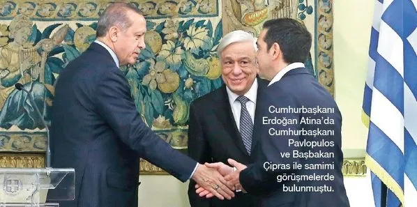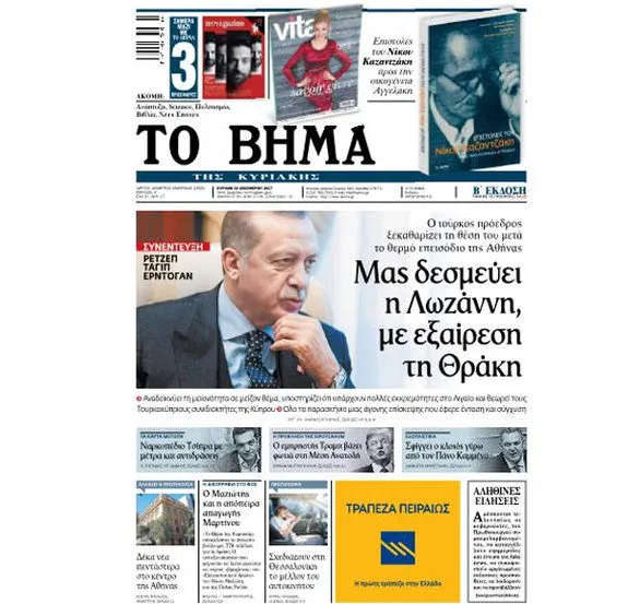 Cumhurbaşkanı Recep Tayyip Erdoğan'ın Yunanistan ziyaretinde yaptığı açıklamaların yankıları sürüyor. Ülkenin önde gelen gazetelerinden To Vima dün Cumhurbaşkanı Erdoğan ile yapılmış bir söyleşisine geniş yer verdi ve söyleşiyi birinci sayfasından büyük bir Erdoğan fotoğrafı ile duyurdu. Söyleşide Erdoğan, azınlıklar, Türkiye-AB ilişkileri, FETÖ, Türkiye- AB ilişkileri, mülteci sorunu, Suriye konusu ve şahsı ile ilgili soruları cevapladı.