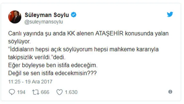 Süleyman Soylu, "Canlı yayında şu anda KK alenen ATAŞEHİR konusunda yalan söylüyor. "İddiaların hepsi açık söylüyorum hepsi mahkeme kararıyla takipsizlik verildi. Eğer böyleyse ben istifa edeceğim. Değilse sen istifa edecek misin??? " dedi.