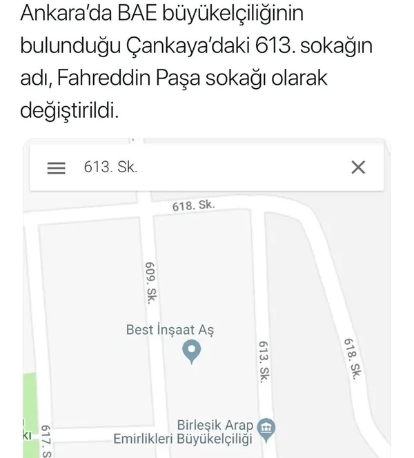 Çankaya'da bulunan BAE Büyükelçiliği'nin bulunduğu 613. Sokak, Fahrettin Paşa Sokak olarak değiştirilecek.
