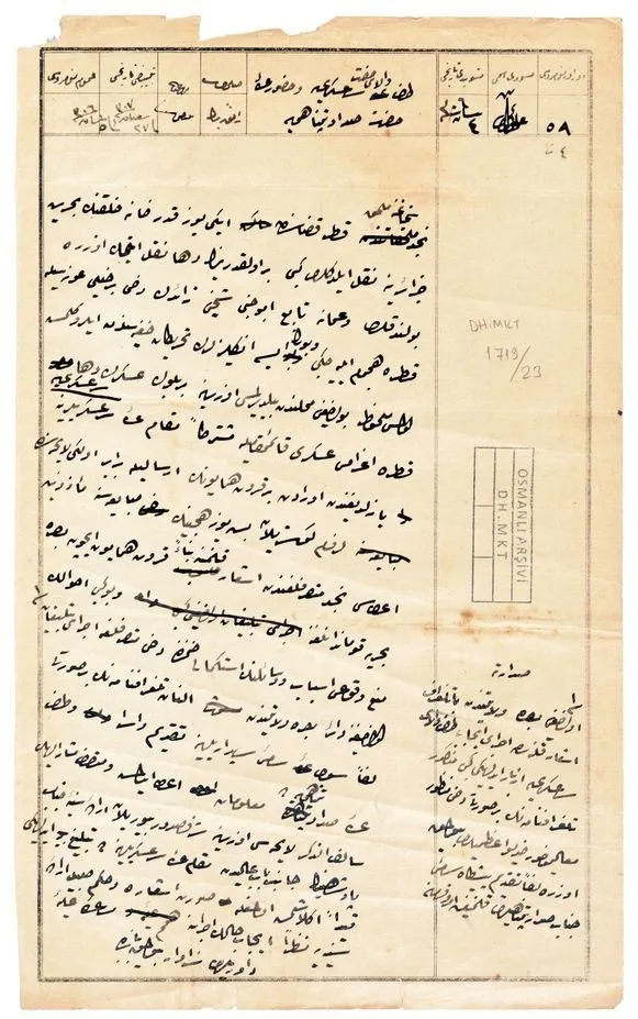 - DH.MKT.1719/23: Katar kazasına İngilizler'in tahrikleriyle Umman'a bağlı Ebu Cinci Şeyhi Zaid vesairlerin hücum edeceği beyanıyla askerî kuvvet gönderilmesi ve at satın alınmasına müsaade edilmesi talebi üzerine bu gibi ahvalin men'i için tebliğde bulunulması ve icabının yapılması.