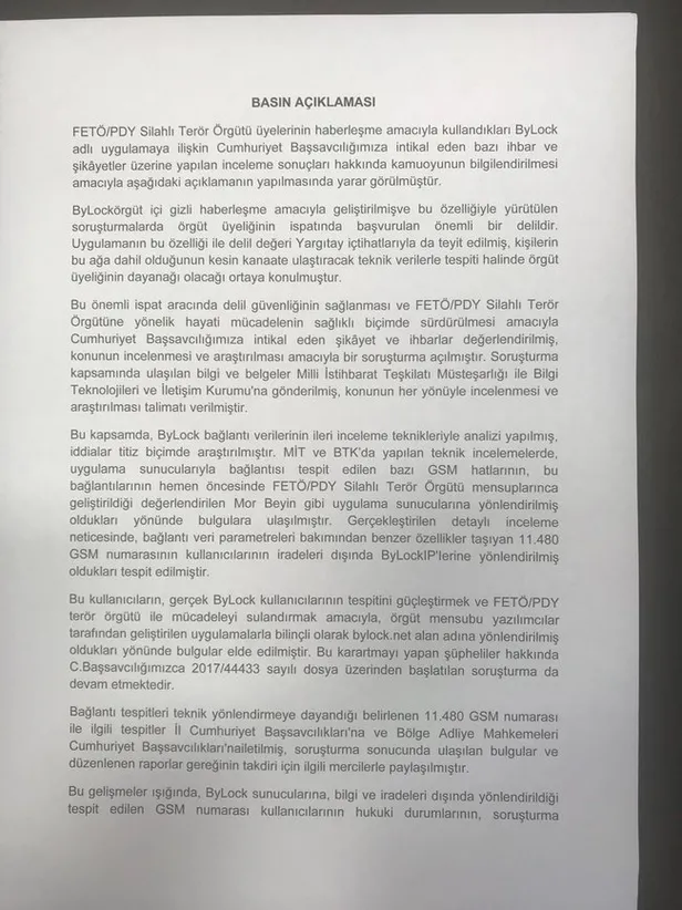 FETÖ/PDY Silahlı Terör Örgütü üyelerinin haberleşme amacıyla kullandıkları ByLock adlı uygulamaya ilişkin Cumhuriyet Başsavcılığımıza intikal eden bazı ihbar ve şikayetler üzerine yapılan inceleme sonuçları hakkında kamuoyunun bilgilendirilmesi amacıyla aşağıdaki açıklamanın yapılmasında yarar görülmüştür.