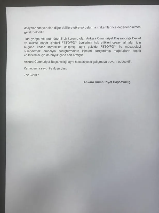 Türk yargısı ve onun önemli bir kurumu olan Ankara Cumhuriyet Başsavcılığı Devlet ve millete ihaner içindeki FETÖ/PDY üyelerinin hak ettikleri cezayı almaları için bugüne kadar kararlılıkla çalışmış, aynı şekilde FETÖ/PDY ile mücadeleyi sulandırmak amacıyla soruşturmalara isimleri karıştırılmış mağdurların tespit edilmesi için de büyük çaba sarf etmiştir.