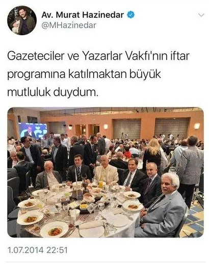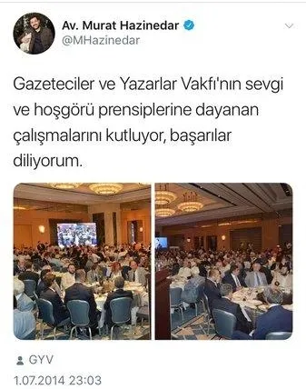 Firari olan Mustafa Yeşil'in başkanlığını yaptığı Gazeteciler ve Yazarlar Vakfı'nın etkinliklerini kaçırmayan Murat Hazinedar, FETÖ'nün Türkiye'ye ve seçilmiş iktidara yaptığı saldırıların zirve yaptığı Temmuz 2014 yılında katıldığı bir iftar programından sonra sosyal medyada şunları paylaşıyor: