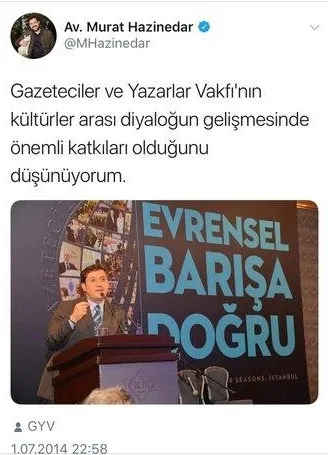 FETÖ medyasına yönelik operasyonlarda en ön safta eylemlere katılan Murat Hazinedar'ın 17/25 Aralık ihanetinden sonra Gazeteciler ve Yazarlar Vakfı'nın Temmuz 2014 tarihinde organize edilen "Evrensel Barışa Doğru" başlıklı etkinliğine katılarak Gülen'e övgüler yağdıran bir konuşma yaptığı ortaya çıktı.