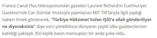 Fransız kanalının bir muhabiri 'Türkiye'nin DEAŞ'a silah gönderdiğini ve MİT TIR'larının yakalandığını' öne sürerek FETÖ ağzıyla Türkiye'ye iftira attı. Soruyu soran muhabirin ise Fransız Canal Plus televizyonunun Laurent Richard olduğu ortaya çıktı. Richard bir gazeteci gibi değil adeta FETö tetikçisi gibi davrandığı anlaşıldı. Cumhuriyet Gazetesi'nde firari terörist Can Dündar'ın MİT TIR'ları haberini baz alan Richard, Türkiye'yi yalan ve iftiralarla algı operasyonuna alet etmek için 'Türkiye'nin DEAŞ'e yardım ediyor' yalanını geçtiğimiz yıllarda diğer ülkelerin liderlerine de sorduğu ortaya çıktı.