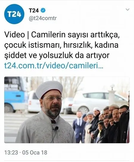 Sosyal medya platformu Twitter'da Diyanet İşleri Başkanı Ali Erbaş'ın fotoğrafıyla paylaşım yapıp Müslümanlara alçakça saldıran T24, "Camilerin sayısı arttıkça, çocuk istismarı, hırsızlık, yolsuzluk da artıyor" ifadeleriyle İslam'a ve Müslümanlara kin kusmuştu.