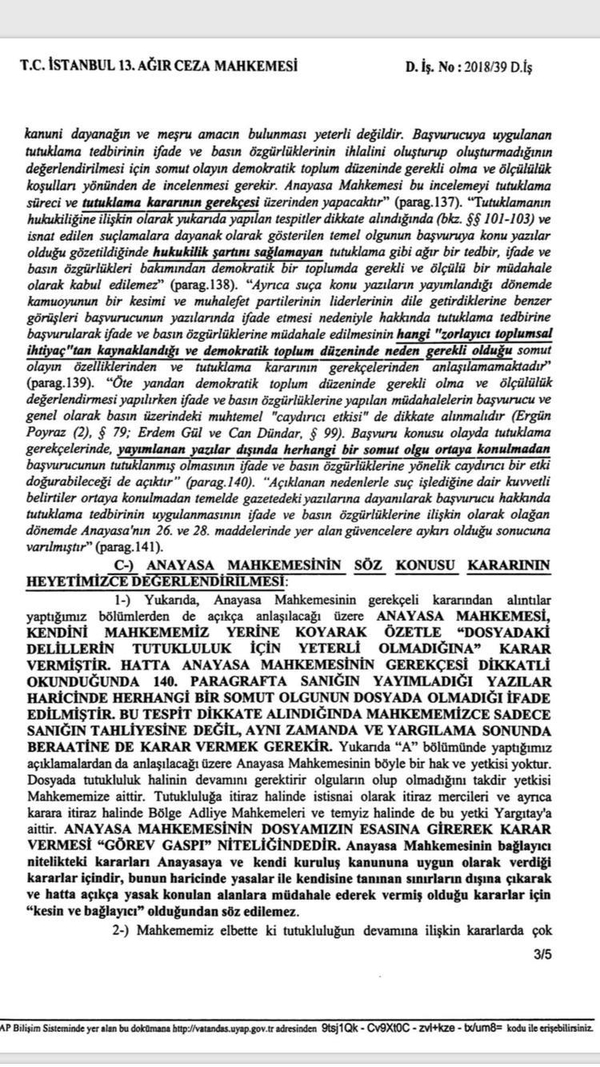"AYM, kendini mahkememiz yerine koyarak özetle, 'Dosyadaki delillerin tutukluluk için yeterli olmadığına' karar vermiştir. Hatta AYM'nin gerekçesi dikkatli okunduğunda 140. paragrafta sanığın yayımladığı yazılar haricinde herhangi bir somut olgunun dosyada olmadığı ifade edilmiştir. Bu tespit dikkate alındığında mahkememiz sadece sanığın tahliyesine değil, beraatine de karar vermek gerekir." Yukarıda yaptığımız açıklamalardan da anlaşılacağı üzere, AYM'nin böyle bir hak ve yetkisi yoktur. Dosyada tutukluluk halinin devamını gerektirir olguların olup olmadığını takdir yetkisi mahkememize aittir.