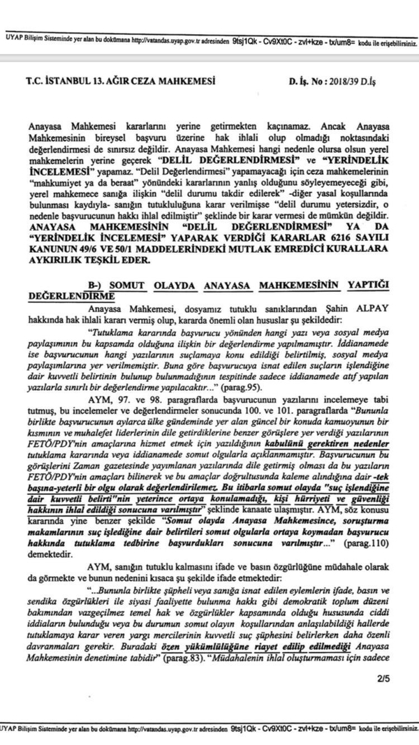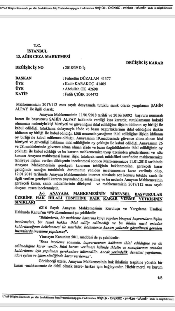 İstanbul 13. Ağır Ceza Mahkemesi; Anayasa Mahkemesi'nin (AYM) "hak ihlali yapıldığı" gerekçesiyle tutuklu FETÖ'cü gazeteci Şahin Alpay hakkında verdiği tahliye kararını ikinci kez reddederken, AYM'te de tam anlamıyla "anayasa" ve "hukuk" dersi verdi. Mahkeme, "yetki gaspı" yaptığını belirttiği AYM'nin "tahliye talebini yerine getirmenin kanunen mümkün olmadığı" görüşünü karar metnine geçirdi.