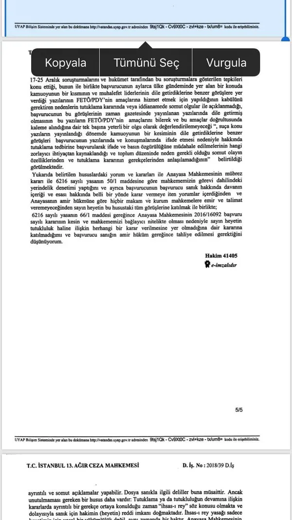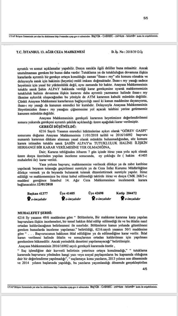 Kararda, üyelerden birinin 'Anayasa Mahkemesi'nin mübrez kararı ile 6216 Sayılı Yasa'nın 66'1 maddesi gereğince AYM'nin kararının kesin ve mahkemeyi bağlayıcı nitelikte olması nedeniyle heyetin tutukluluk haline ilişkin herhangi bir karar verilmesine yer olmadığına dair kararına katılmadığı ve başvurucu sanığın amir hükmü gereğince tahliye edilmesi gerektiği' şeklinde muhalefet şerhi düştüğü bilgisine de yer verildi.