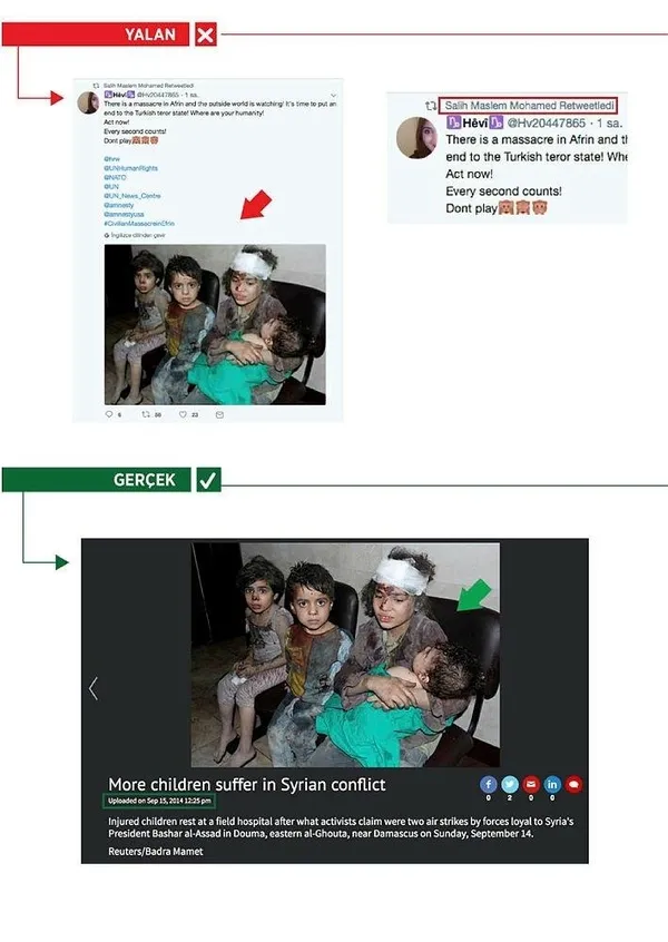 Sosyal medyada Zeytin Dalı Harekatı'nı karalama amacıyla paylaşılan çok sayıda fotoğrafın, harekatla hiçbir ilgisi olmadığı ispatlanmıştı.