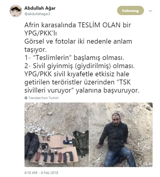 Ağar açıklamasında "Afrin kırsalında teslim olan bir YPG/PKK'lı" diyerek paylaştığı fotoğraflar için "Görsel ve fotolar iki nedenle anlam taşıyor. 1- "Teslimlerin" başlamış olması. 2- Sivil giyinmiş (giydirilmiş) olması." dedi.
