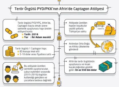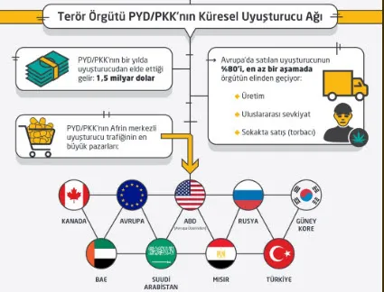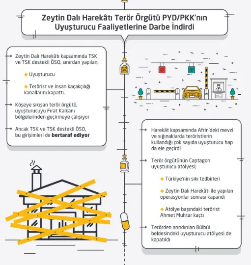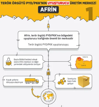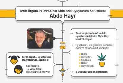 TSK'nın ÖSO ile birlikte Zeytin Dalı Harekatı'nı yürüttüğü Afrin beldesinin aslında teröristlerin uyuşturucu merkezi olduğu ortaya çıktı. Terör örgütü PYD/PKK'nın Afrin'deki uyuşturucu sorumlusu ise, Abdo Hayr.