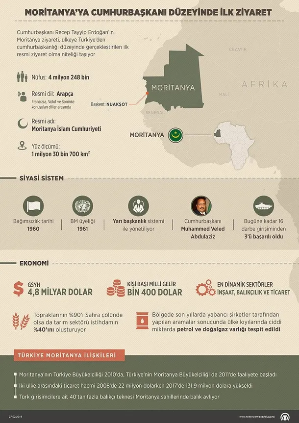 Moritanya ise Türkiye'den ilk yapılan üst düzey ziyaret için adeta seferberlik ilan etti.Yerel basında çıkan haberlere göre, sosyal medya üzerinden haberleşen binlerce Moritanyalı, Cumhurbaşkanı Erdoğan'ın ziyareti esnasında "destek gösterisi" düzenleme çağrısı yaptı.