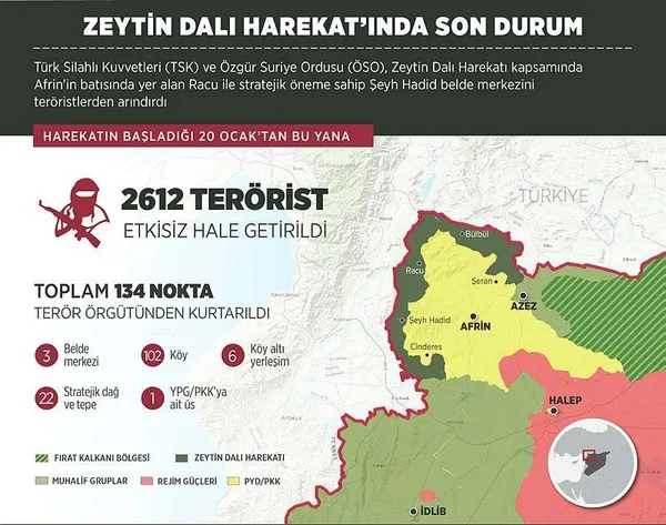 TSK ve operasyonlara destek veren ÖSO güçleri, harekatın başından bu yana YPG/PKK-DEAŞ'ın işgalindeki Afrin'de 2'si belde merkezi, 102'si köy, 6'sı köy altı yerleşim ve 21'i stratejik dağ veya tepe, biri YPG/PKK'ya ait üs olmak üzere 132 noktayı ele geçirdi.